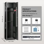 Mounting Hole: bottom: 4; back: 6,Bullet Storage Box: 9.4”x2.4”/240×60 mm,Bolts: 3,Material: Q235 Cold-rolled Steel Sheet,Door Plate Thickness: 0.07”/1.8mm,Pistol Placing Rack: 13.8”x1.3”/350×30 mm, Removable,Code: 3-12 Digits,Working Power Supply: 4 PCS AA batteries,Cabinet Wall Thickness: 0.04 “/1.1mm,Product Size: 13.8”x11.8”x57”/350x300x1447 mm,Automatic Lock: YES,Rifle Storage: 5,Rifle Placing Rack: 13.8”x1.3”/350×30 mm, Adjustable